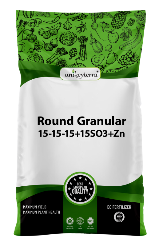 Round Granular 15‑15‑15+15SO3+Zn is a preferred fertilizer in fruit and vegetable cultivation, especially field crops such as corn, sunflower, sugar beet and potatoes. Its nitrogen, phosphorus and potassium contents are balanced. When the granules applied during subsoil fertilization dissolve with soil water, all three nutrients are easily absorbed by the plants by quickly coming into contact with the plant roots.